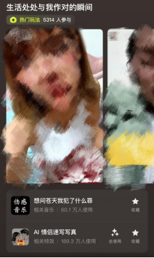 12日,九派新闻在社交平台搜索相关特效,发现使用该特效的若干视频可以浏览,部分视频热度很高。点击“拍同款”,特效一栏却变成“AI情侣速写写真”,进入拍摄页面后,会出现同款伤感音乐,未出现同款受伤效果。